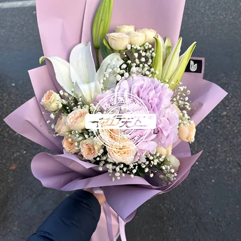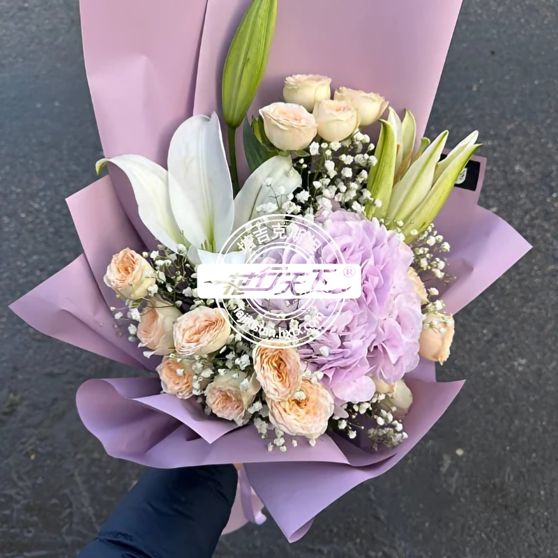 描述: 玫瑰、百合、绣球花组成、精美包装。